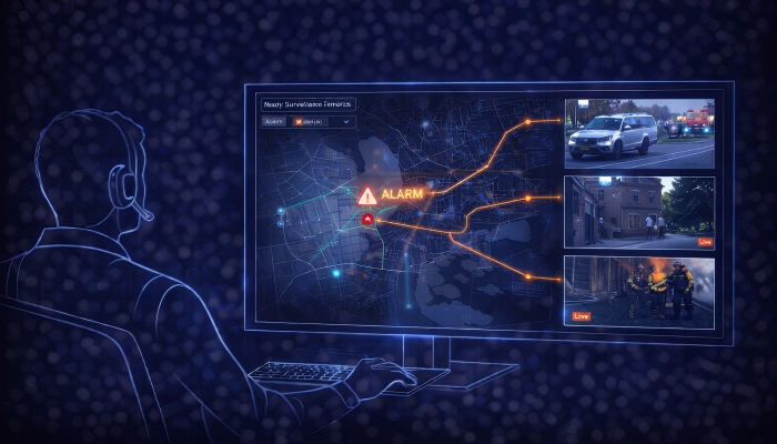 Displays nearby surveillance video based on alarm location, enabling real-time situational awareness and decision-making.