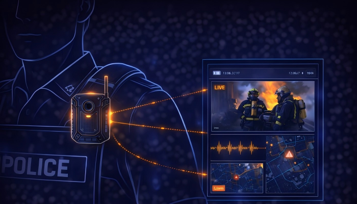 Body-worn cameras transmit live video, audio, and positioning data during emergencies for immediate response.